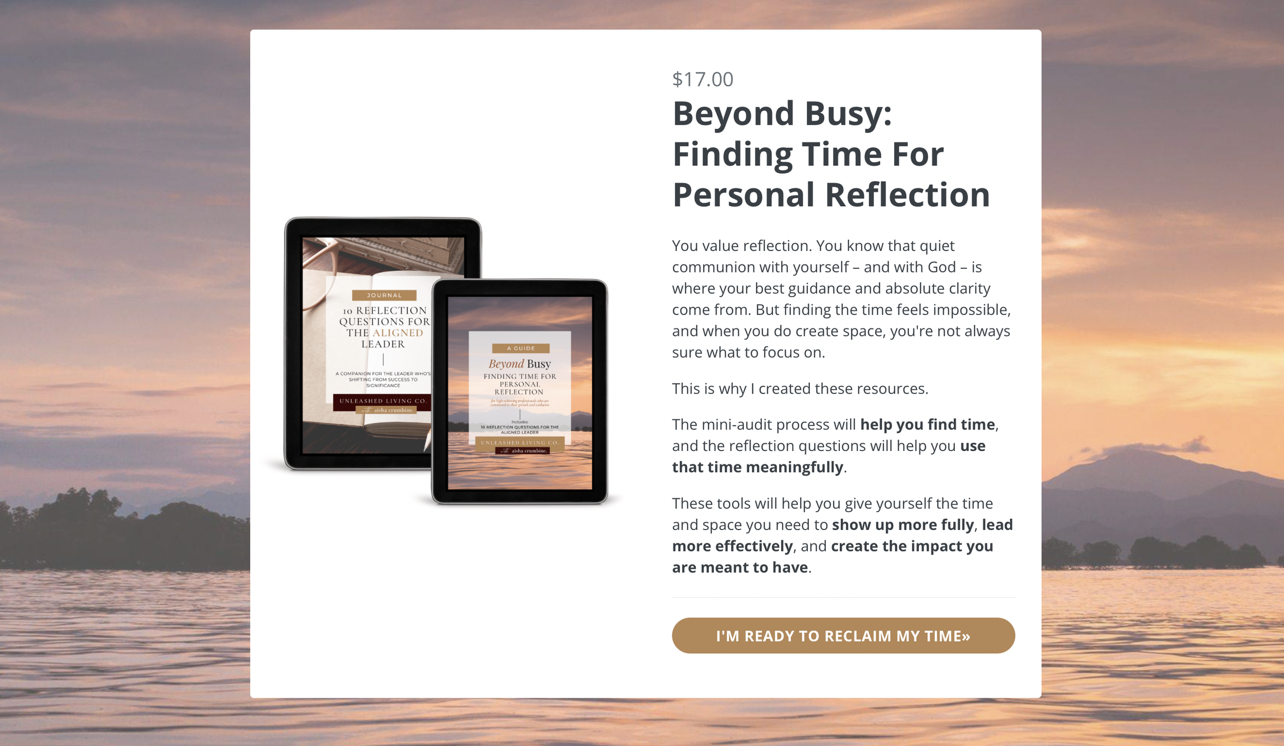 My Beyond Busy resource guide ($17) walks you through a mini-audit process that shines a light on where your time is leaking away. It also includes a bonus 20 Reflection Questions for Aligned Leaders. Beyond Busy is a simple way to start reclaiming that 5% of your time—today.